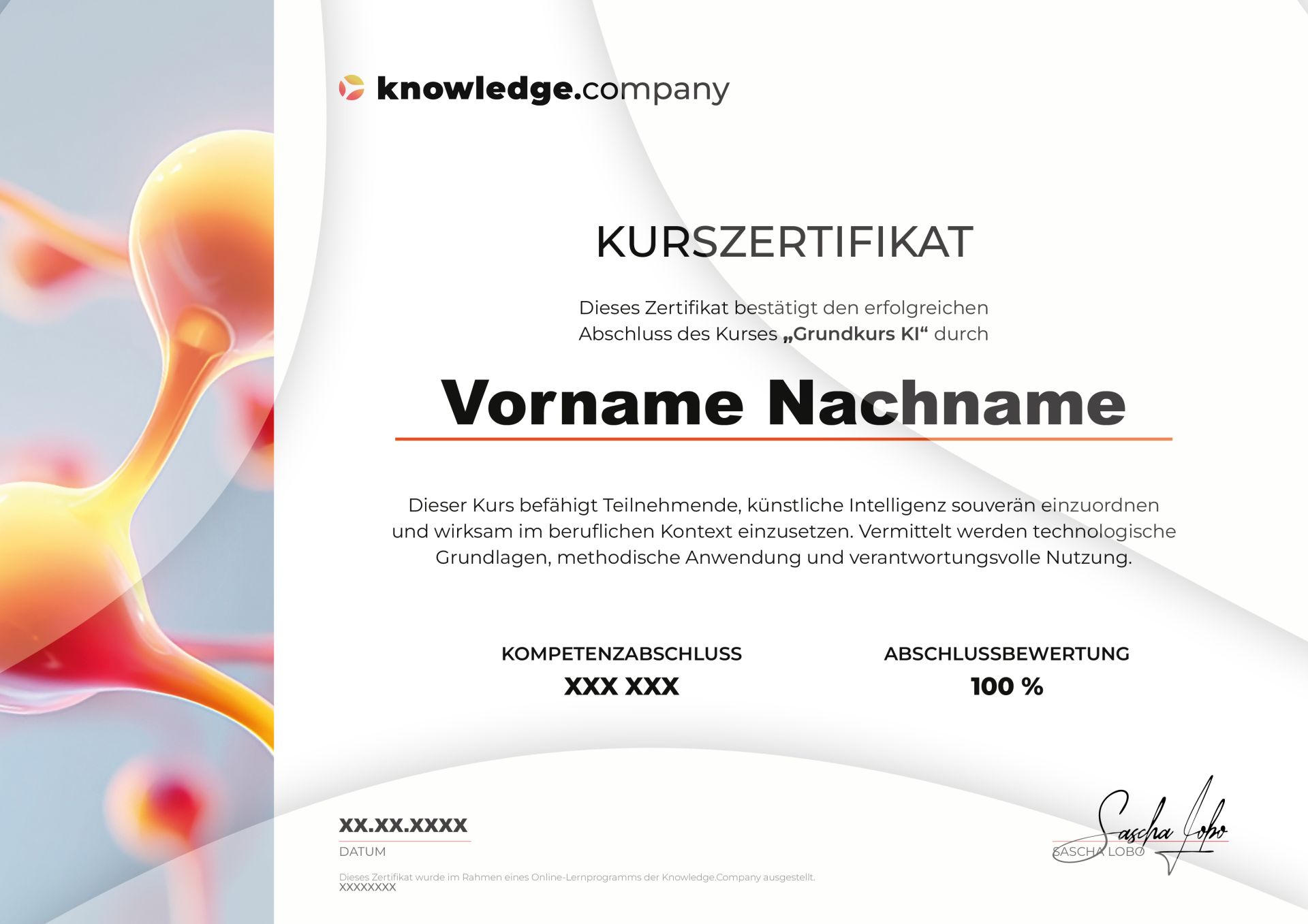 Am Ende des Kurses steht mehr als Wissen – es steht echte Kompetenz. Unser HR-relevantes Zertifikat bestätigt, dass Mitarbeitende die Grundlagen von KI sicher und praxisnah anwenden können. Ein greifbares Ergebnis, das Fortschritt sichtbar macht und Unternehmen stärkt.